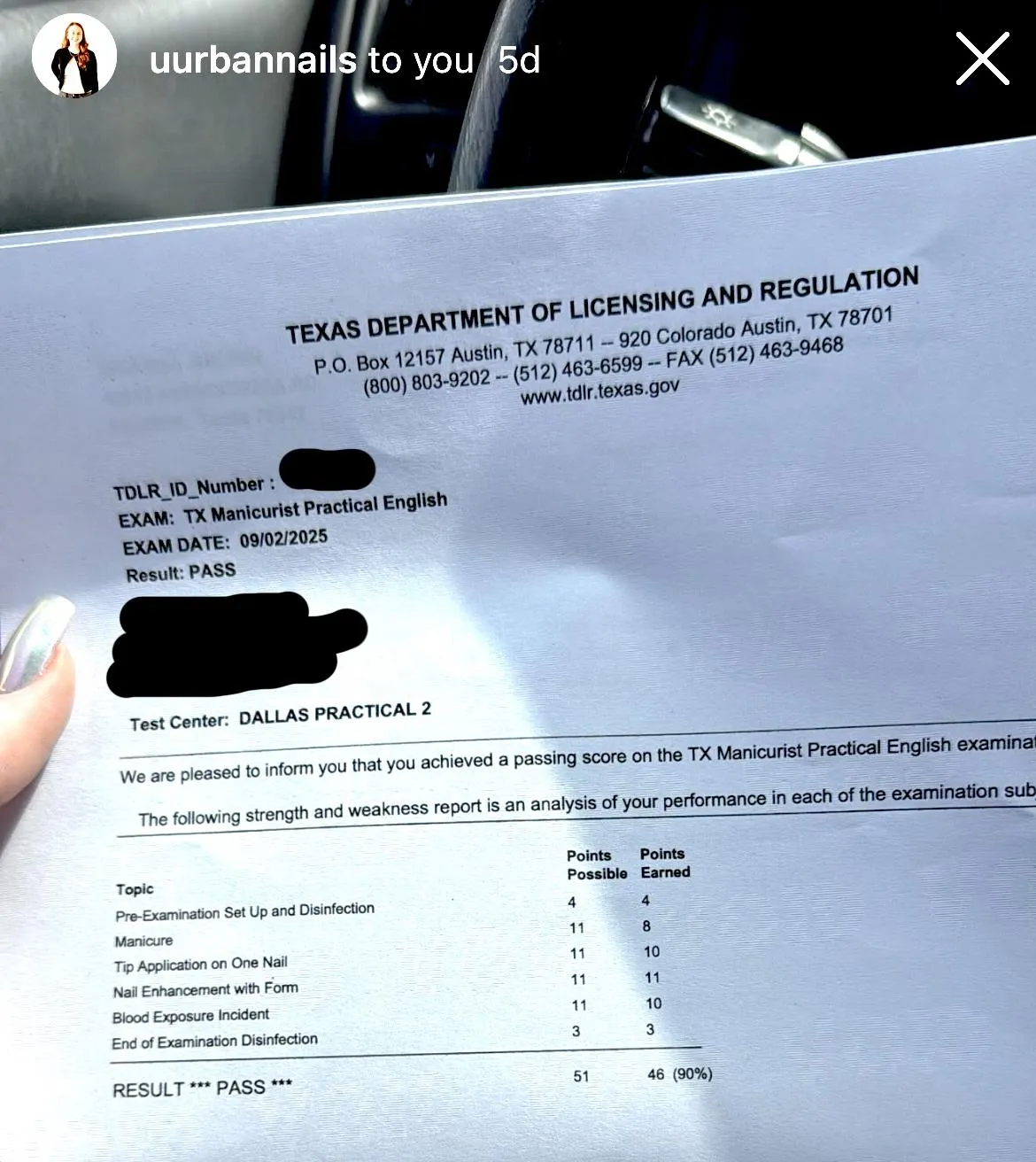 A: Nail School Companion was designed specifically around the Texas State Board Manicurist Written & Practical Exams, so everything in the course is aligned with the rules, procedures, and testing style required by the Texas Department of Licensing & Regulation (TDLR).